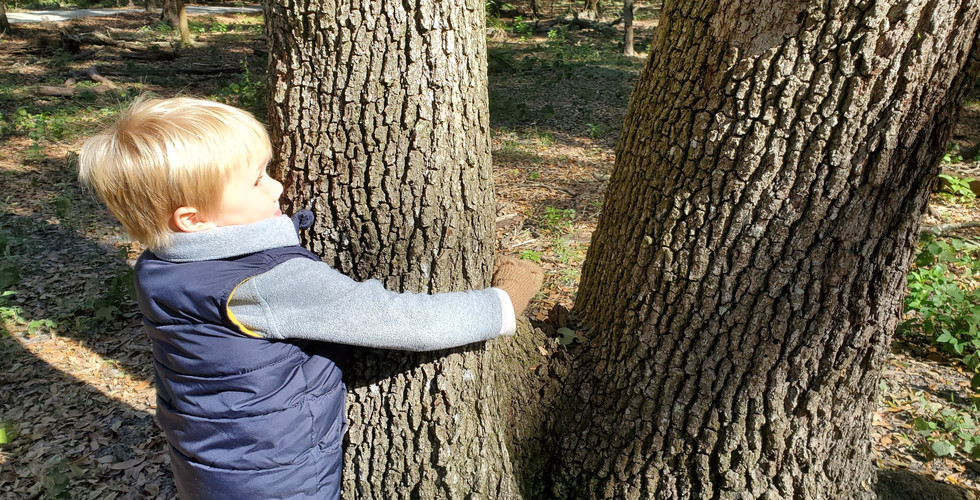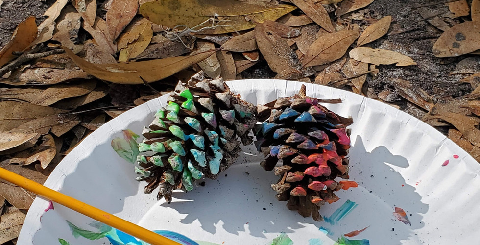 Our Wednesday forest school location has been bustling with activity as well. The children cleared out an area of basecamp all by themselves. They created a campsite with seating and an imaginary fire! We painted sticks and palm fronds, created bonds with several trees, and made tree rubbings. We also discovered there is a grapefruit tree nearby! Every Wednesday we end our time together by walking the nature trail. We spend some time by the lake searching for the female alligator. We always find the Limpins, Ibis, and Blue Herons by the waters edge looking for food.